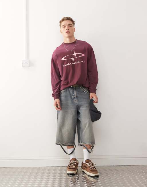 COLLUSION – Fioletowy sprany T-shirt typu skater z długimi rękawami i nadrukiem