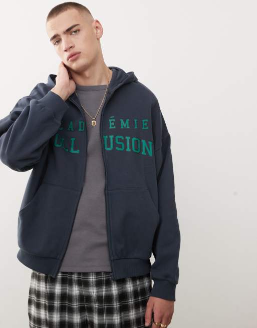 COLLUSION – Granatowa bluza z kapturem o pudełkowym fasonie z nadrukiem w uczelnianym stylu