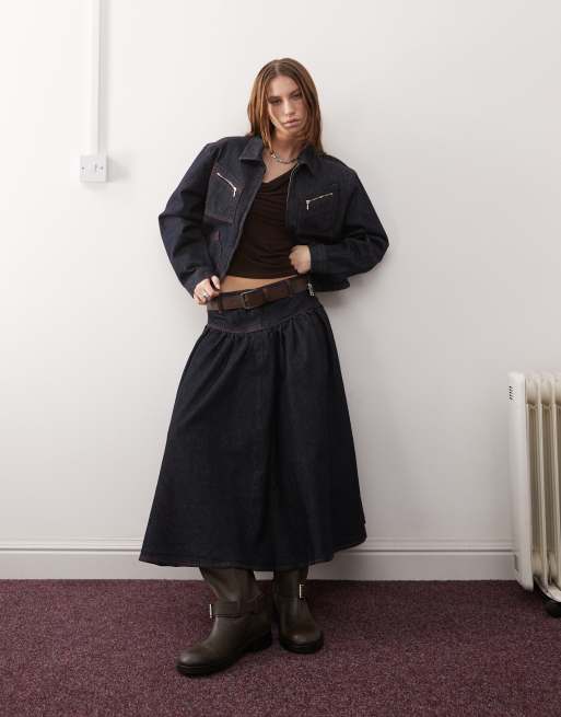 COLLUSION – Granatowa jeansowa spódnica midi z obniżoną talią, część zestawu