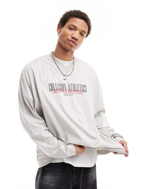 COLLUSION – Jasnoszara bluza dresowa z dekoltem w szpic z nadrukiem w uczelnianym stylu