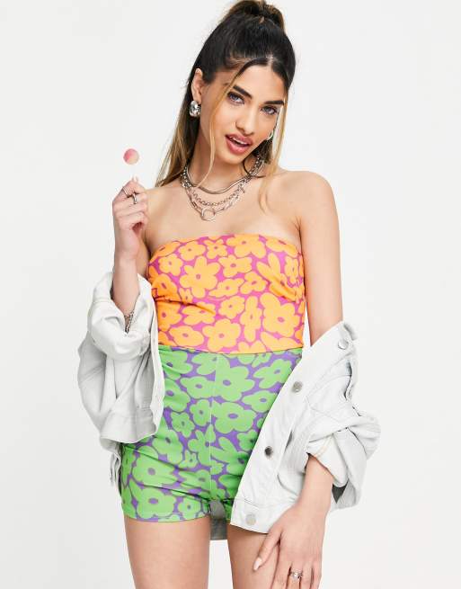 COLLUSION – Kolorowy, krótki kombinezon bandeau w kwiatowy wzór