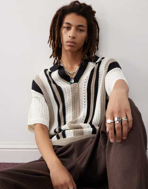 COLLUSION – Kremowa koszulka polo w paski z dekoltem w szpic