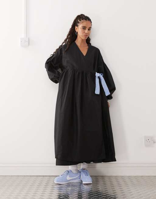 COLLUSION – Luźna kopertowa sukienka maxi oversize w czarnym kolorze z kontrastowym wiązaniem w kratkę vichy