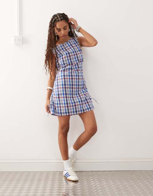 COLLUSION – Niebieska sukienka mini w kratę z dekoltem w łódkę