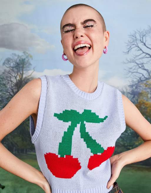 COLLUSION – Niebieski dzianinowy top bez rękawów ze wzorem w wiśnie