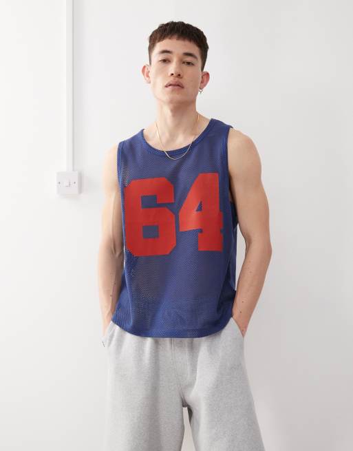 COLLUSION – Niebieski, szydełkowy top bez rękawów z nadrukowaną liczbą w stylu varsity