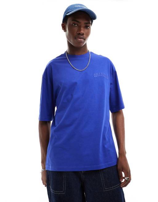 COLLUSION – Niebieski T-shirt z haftowanym napisem w uczelnianym stylu