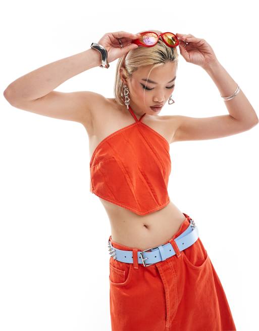 COLLUSION – Pomarańczowy jeansowy top z dekoltem typu halter i kontrastowymi szwami, część zestawu