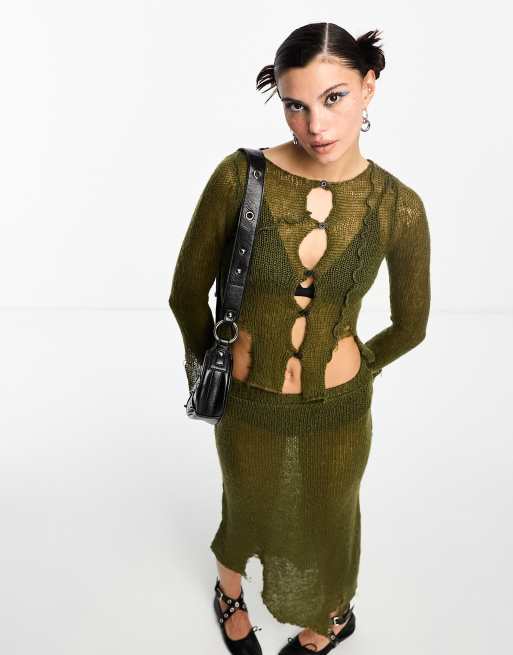 COLLUSION – Postrzępiony top z ażurowej dzianiny w kolorze khaki, część zestawu