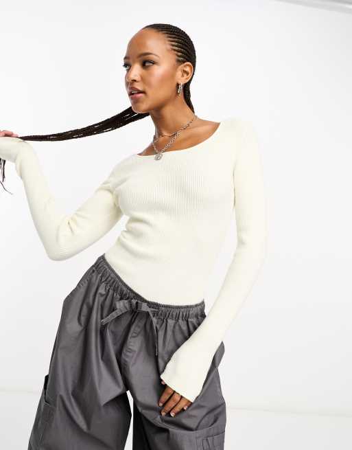 COLLUSION – Prążkowany dzianinowy sweter w kolorze ecru z dekoltem w kształcie litery U