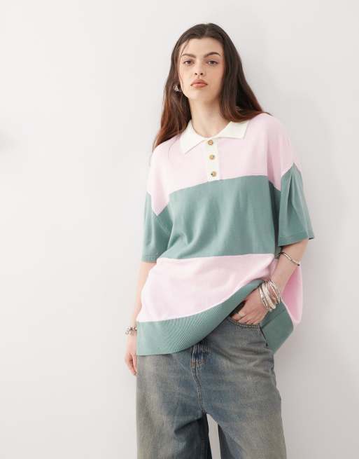 COLLUSION – Różowo-zielona koszulka polo w stylu rugby z dzianiny w paski