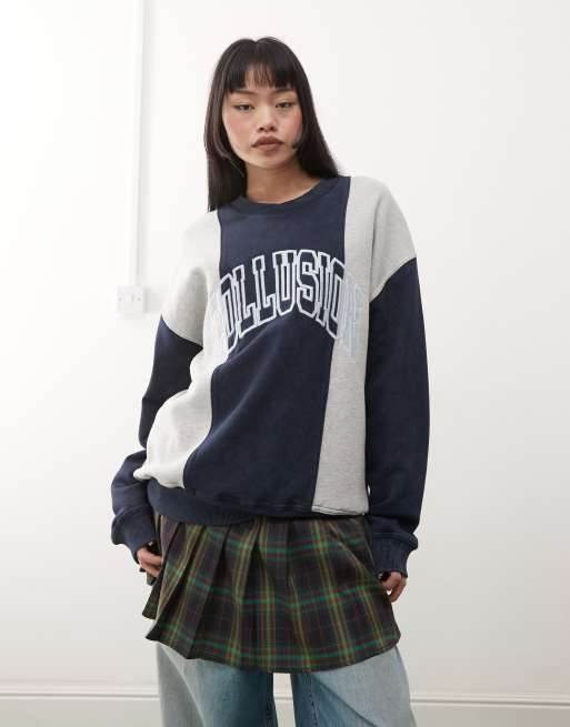 COLLUSION – Szara melanżowa bluza retro z łączonych elementów, z haftem