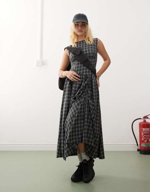 COLLUSION – Szara popelinowa sukienka midi ze spódnicą o kroju bombki w kratkę