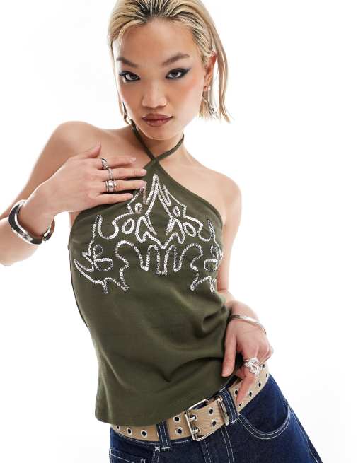 COLLUSION – Szary sprany top z dekoltem halter i cekinami