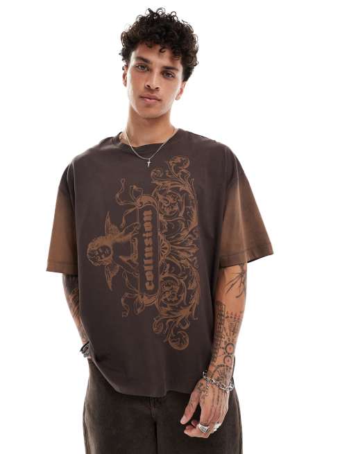 COLLUSION – T-shirt oversize w brązowym kolorze z efektem ombre i nadrukiem z kupidynem i krzyżem
