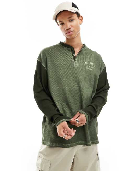 COLLUSION – T-shirt z długimi rękawami w uczelnianym stylu w kolorze khaki i zielonym