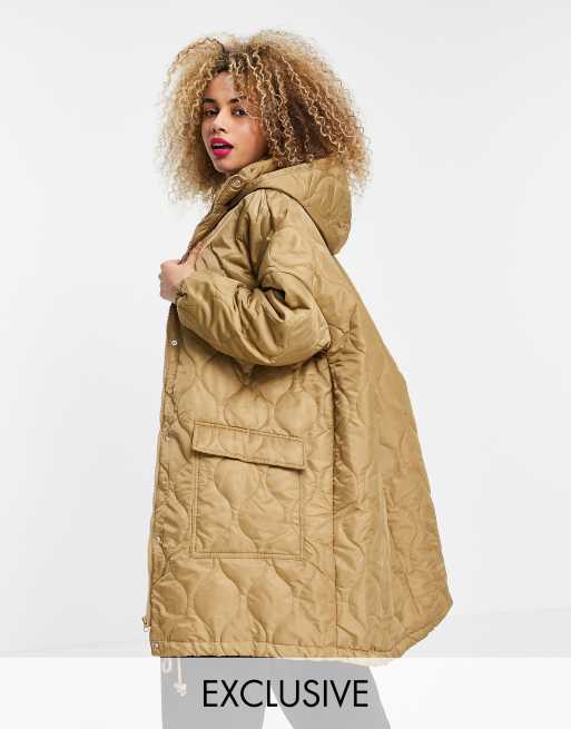 COLLUSION Unisex – Beżowa cienka pikowana kurtka o wydłużonym fasonie