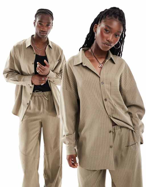 COLLUSION Unisex – Brązowa koszula oversize w prążki, część zestawu