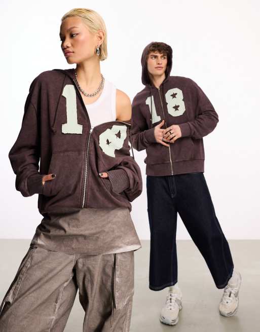 COLLUSION Unisex – Brązowa zapinana na zamek bluza z kapturem i ozdobną aplikacją