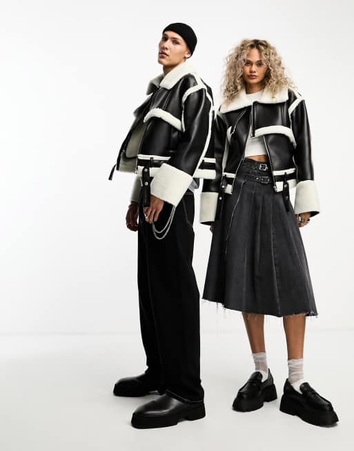 COLLUSION Unisex – Czarna kurtka aviator z imitacji skóry z kontrastową podszewką