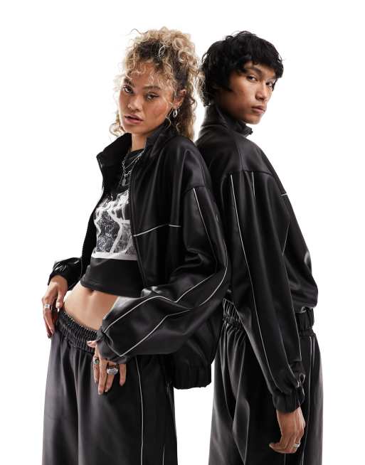 COLLUSION Unisex – Czarna poliuretanowa kurtka dresowa, część zestawu