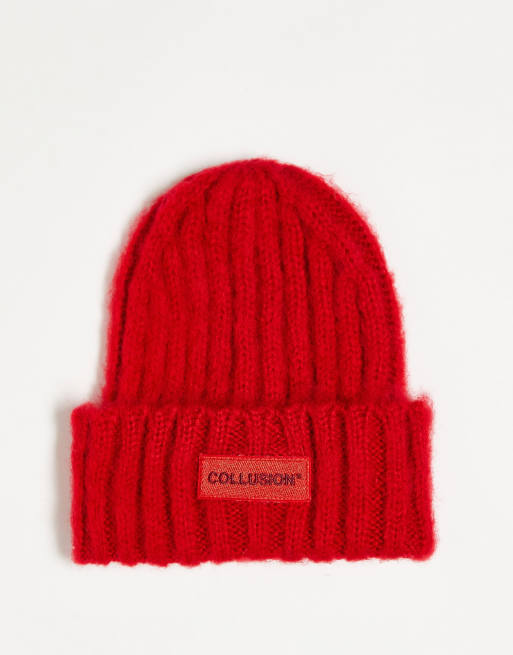 COLLUSION Unisex – Czerwona czapka beanie z puszystej przędzy z dopasowanym kolorystycznie logo