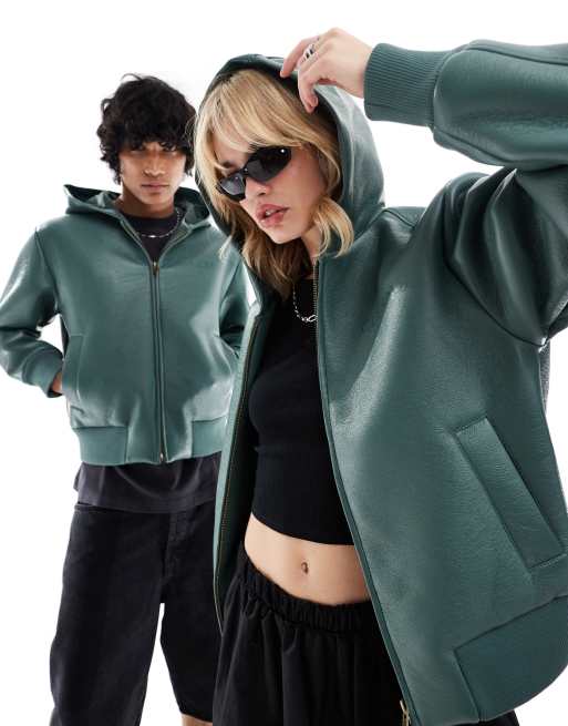 COLLUSION Unisex – Panelowa kurtka bomberka z kapturem z imitacji skóry w kolorze leśnej zieleni