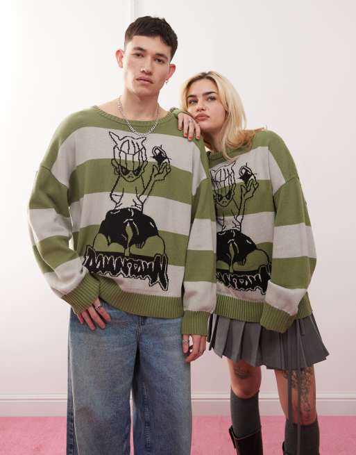 COLLUSION Unisex – Sweter oversize w zielone paski z grafiką