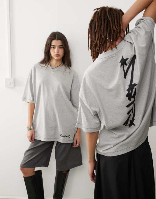 COLLUSION Unisex – Szary melanżowy T-shirt z nadrukiem z logo