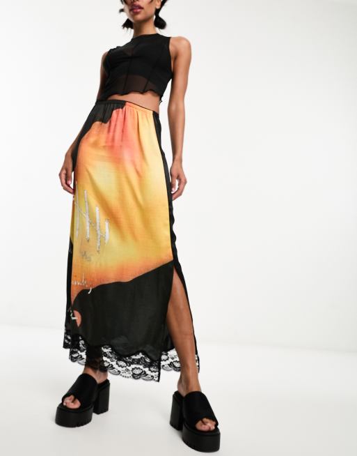 COLLUSION – Wykończona koronką wsuwana satynowa spódnica maxi ze wzorem
