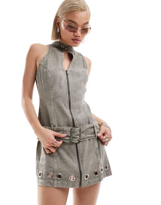 COLLUSION – Zielona sukienka mini z diagonalu z ozdobnymi przelotkami