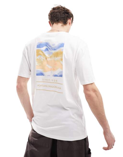 Columbia – Barton Springs – T-shirt z brzoskwiniowym nadrukiem na plecach – tylko w ASOS