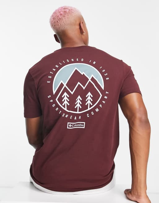 Columbia – Tillamook – Bordowy T-shirt z nadrukiem na plecach – tylko w ASOS