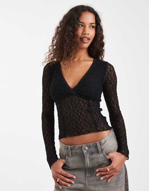 Cotton On – Zali – Skrzyżowany czarny koronkowy top z długimi rękawami
