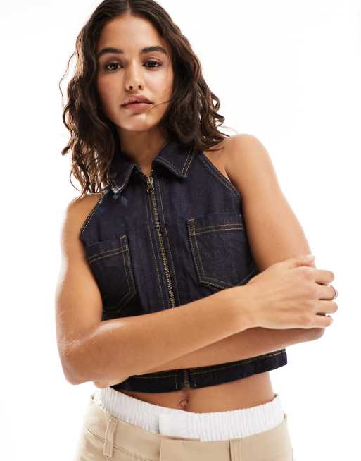 Cotton On – Dopasowany jeansowy top bez rękawów z dekoltem halter i zamkiem z przodu