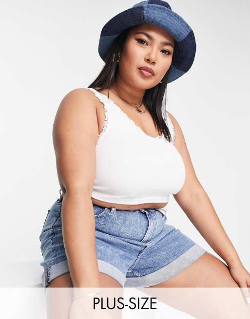 Daisy Street Plus – Biały, krótki top prążkowany z koronkowym wykończeniem