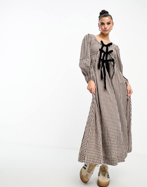 Damson Madder – Dakota – Czekoladowa sukienka midi w kratkę vichy z ozdobnymi kokardkami