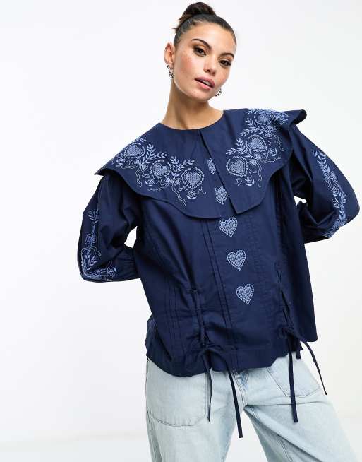 Damson Madder – Juliette – Granatowa bluzka z haftowanym wzorem na kołnierzu