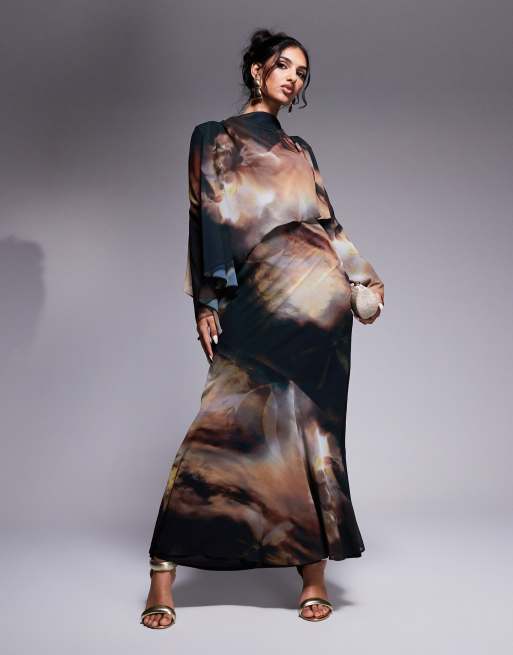 Daska – Ciemna szyfonowa sukienka maxi we wzór