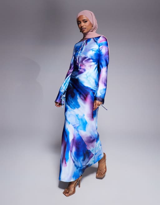 Daska – Satynowa sukienka maxi w kolorze kobaltowym w abstrakcyjny wzór