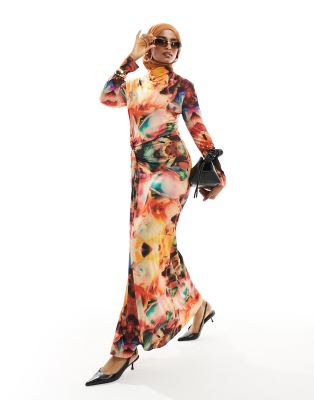 Daska – Sukienka maxi z długim rękawem i skręconym przodem w kolorowy wzór