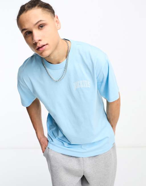 Dickies – Aitkin – Jasnoniebieski T-shirt z logo w uczelnianym stylu po lewej stronie piersi