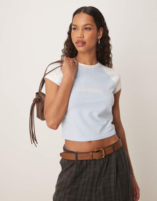Dickies – Niebiesko-błękitny krótki i obcisły T-shirt z raglanowymi rękawami i logo w kowbojskim stylu