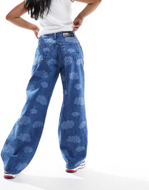 Dr Denim – Hill – Niebieskie luźne jeansy z szerokimi, prostymi nogawkami i niskim stanem w laserowy wzór w chmurki