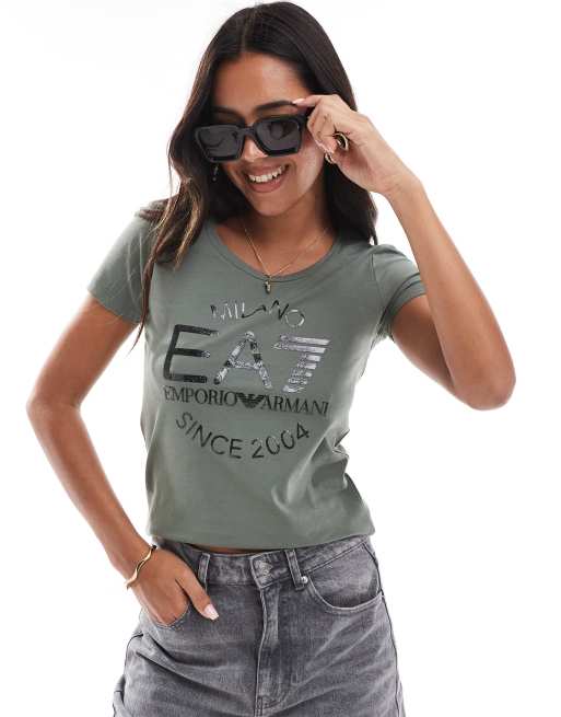 EA7 – Zielony T-shirt z czarnym brokatowym logo z przodu
