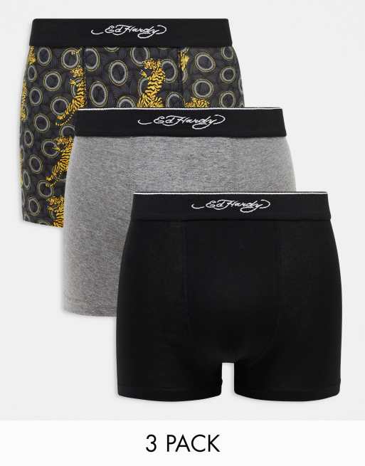 Ed Hardy – Bazire – Zestaw 3 par bokserek w kolorach czarnym i szarym z tatuażowym wzorem