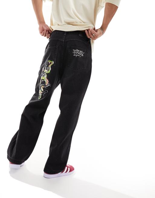 Ed Hardy – Jeansy z prostymi nogawkami o luźnym kroju w spranym szarym kolorze z haftowanym wzorem