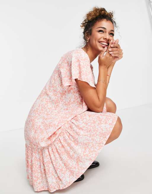 En Crème – Różowa luźna sukienka w kwiatki z plisowanym dołem