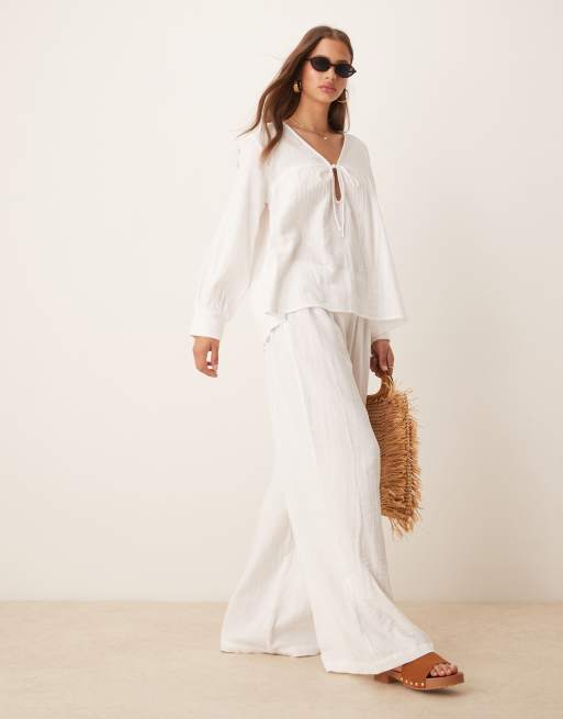 Esmee Exclusive – Wiązane z przodu białe spodnie plażowe o luźnym kroju