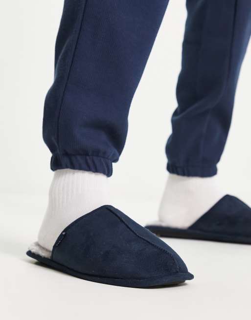 Farah – Wsuwane granatowe mule z podszewką z szarego sztucznego futra